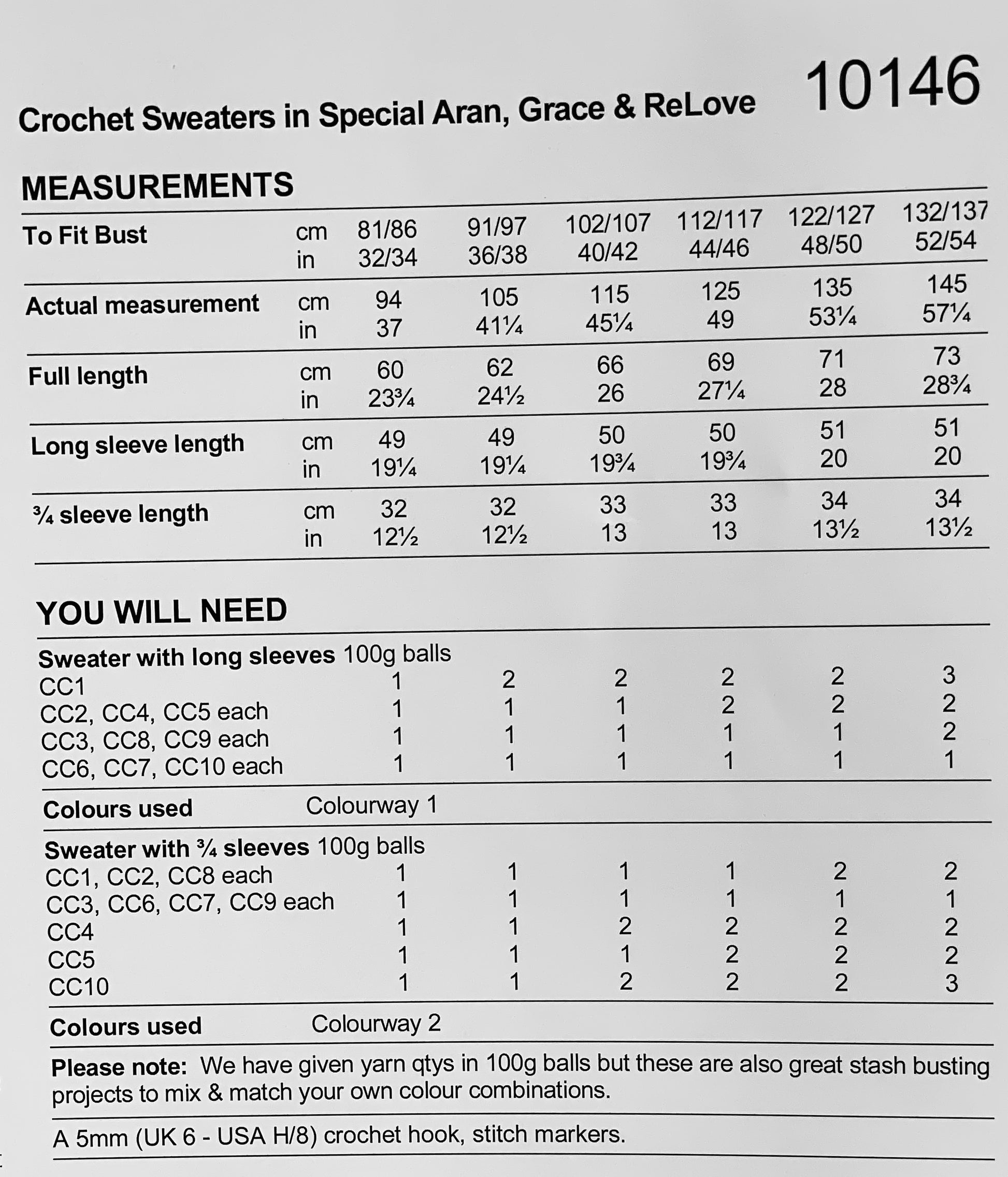 | Special Aran, Cream 1005 | 1 | 1 | 1 | 2 | 2 | 2 |
