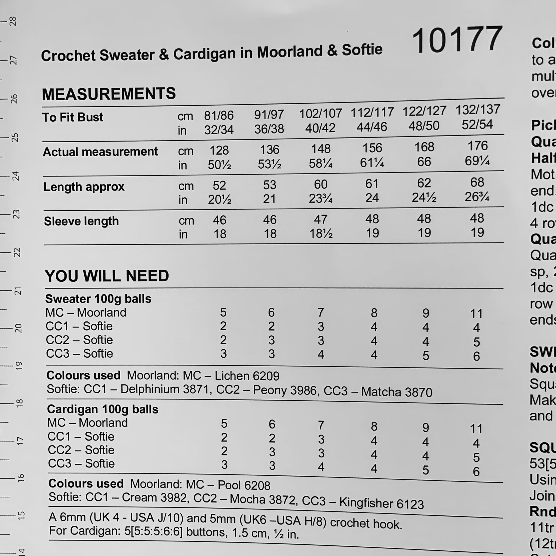 STYLECRAFT 10177 offers a detailed knitting pattern designed for both cardigans and sweaters, available in a wide range of sizes from 81 cm (32 in) to 137 cm (54 in). The cardigan requires 5 to 6 buttons measuring 1.5 cm (½ in) and uses multiple yarn shades including Moorland Pool, Softie Cream, Kingfisher, and Mocha. The sweater version features Moorland Lichen and Softie hues like Delphinium, Matcha, and Peony. Recommended crochet hook sizes are 6mm (UK 4 - USA J/10) and 5mm (UK 6 - USA H/8) to achieve the best stitch definition and fit. This versatile pattern is ideal for experienced knitters aiming for skilled craftsmanship.